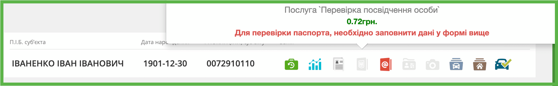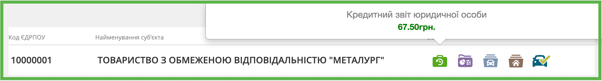 Результатом пошуку буде коротка ідентифікація знайденого суб’єкта та набір іконок, що відображають звіти, які можна отримати за суб’єктом.