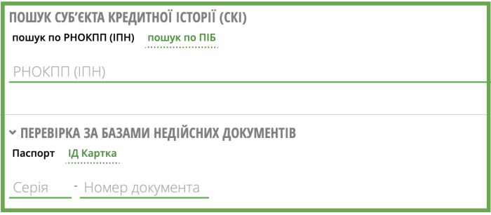 Для отримання звітів, що містять інформацію про суб’єкта кредитної історії з державних реєстрів, інших баз даних публічного користування, відкритих для загального користування джерел, необхідно здійснити пошук суб’єкта кредитної історії (СКІ), ввівши його РНОКПП (ІПН) у відповідне поле та натиснути кнопку «ШУКАТИ».