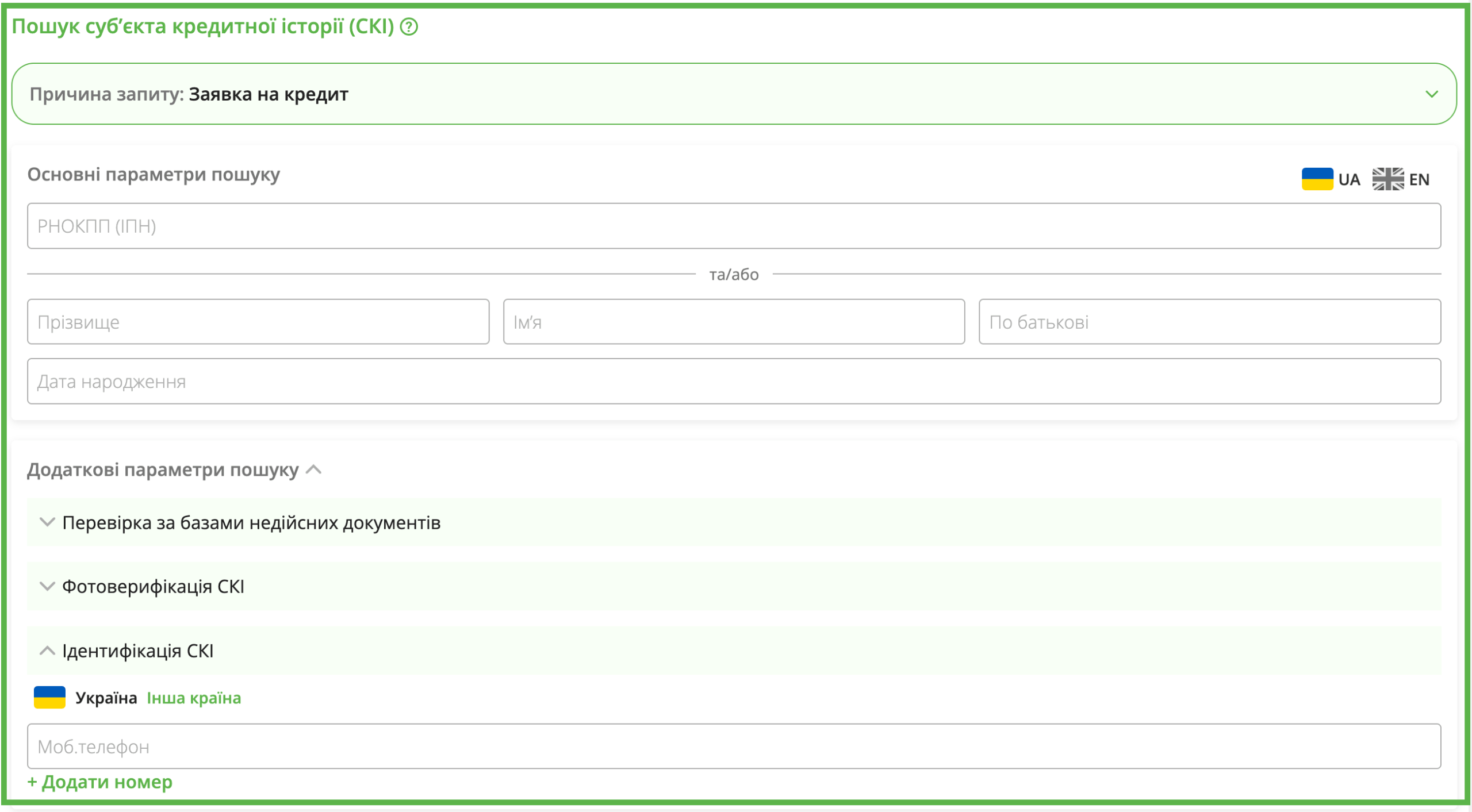 Для отримання звітів з державних реєстрів та інших публічних джерел необхідно здійснити пошук суб’єкта кредитної історії (СКІ), ввівши його РНОКПП (ІПН) у відповідне поле, обравши причину запиту відповідно до його мети та натиснути кнопку «ПОШУК».