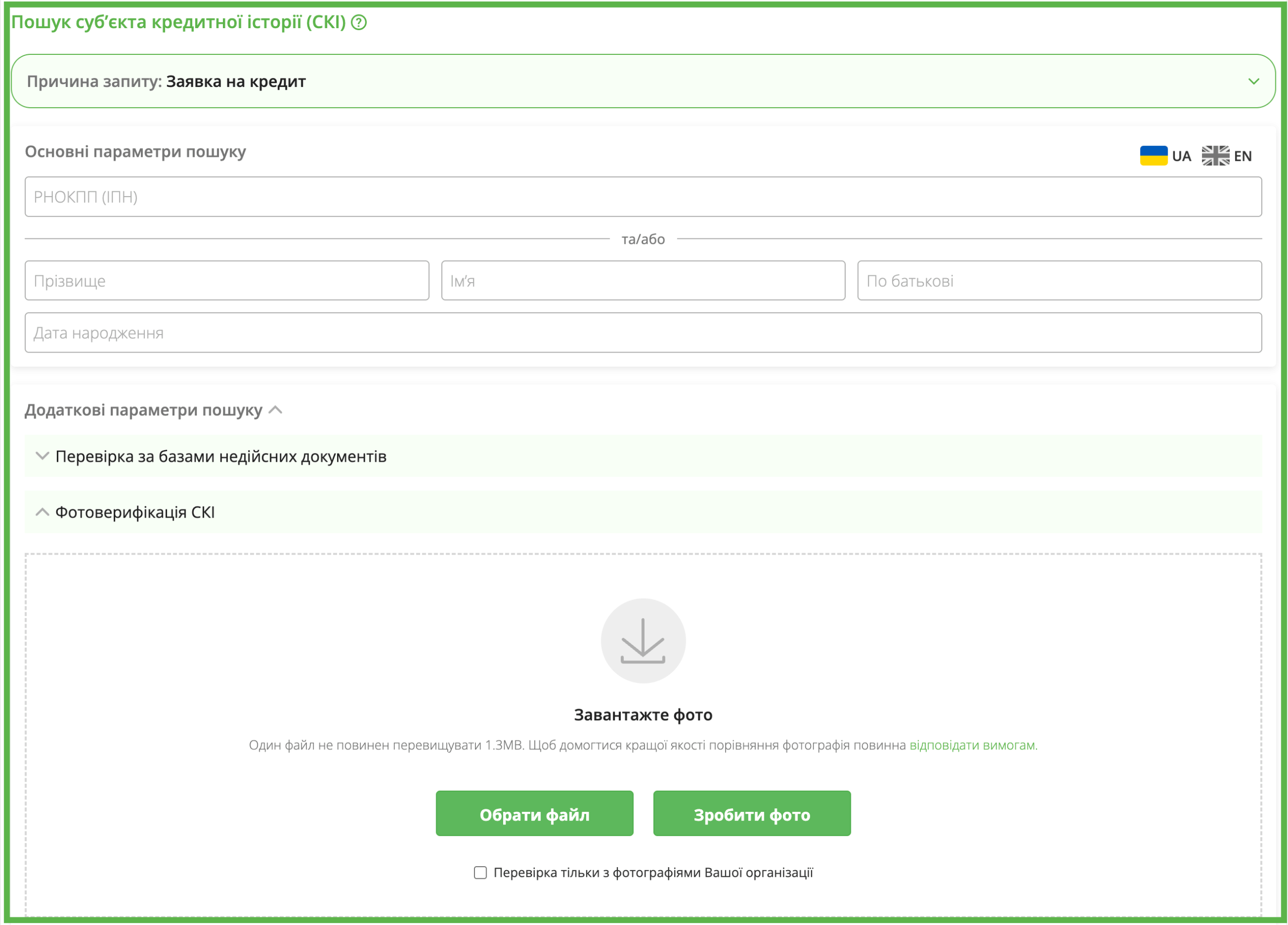 Для отримання звіту необхідно ввести у полі пошуку РНОКПП (ІПН) клієнта, розгорнути панель Додаткові параметри пошуку – Фотоверифікація СКІ – вибрати зручний для себе варіант завантаження фото для перевірки: